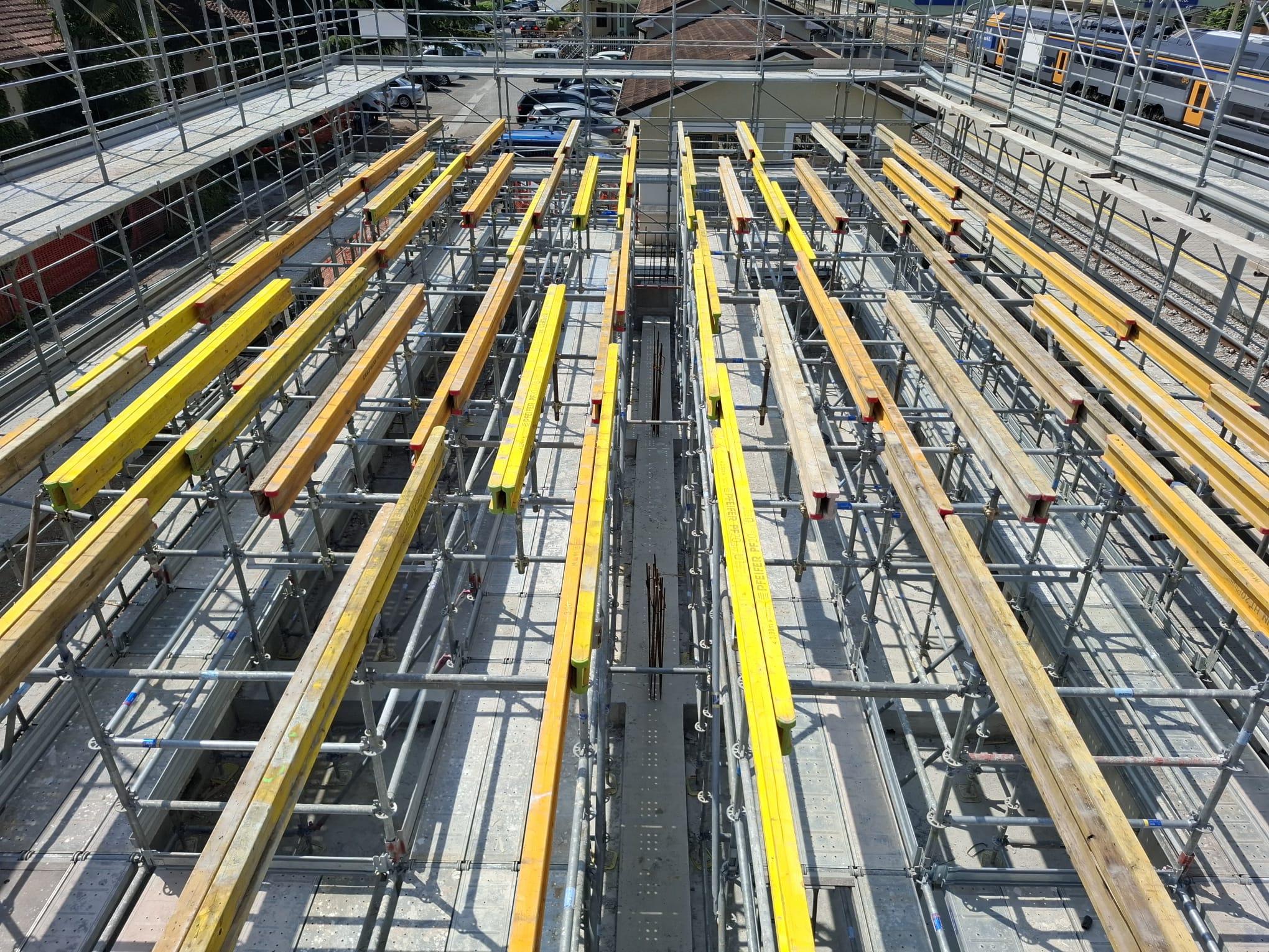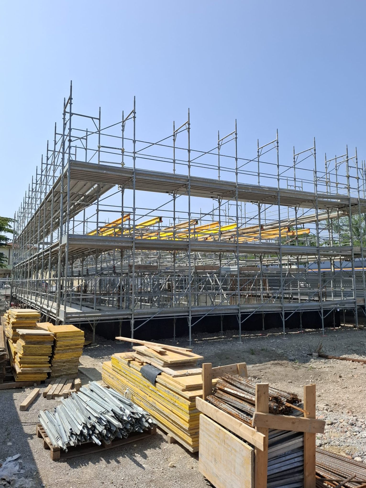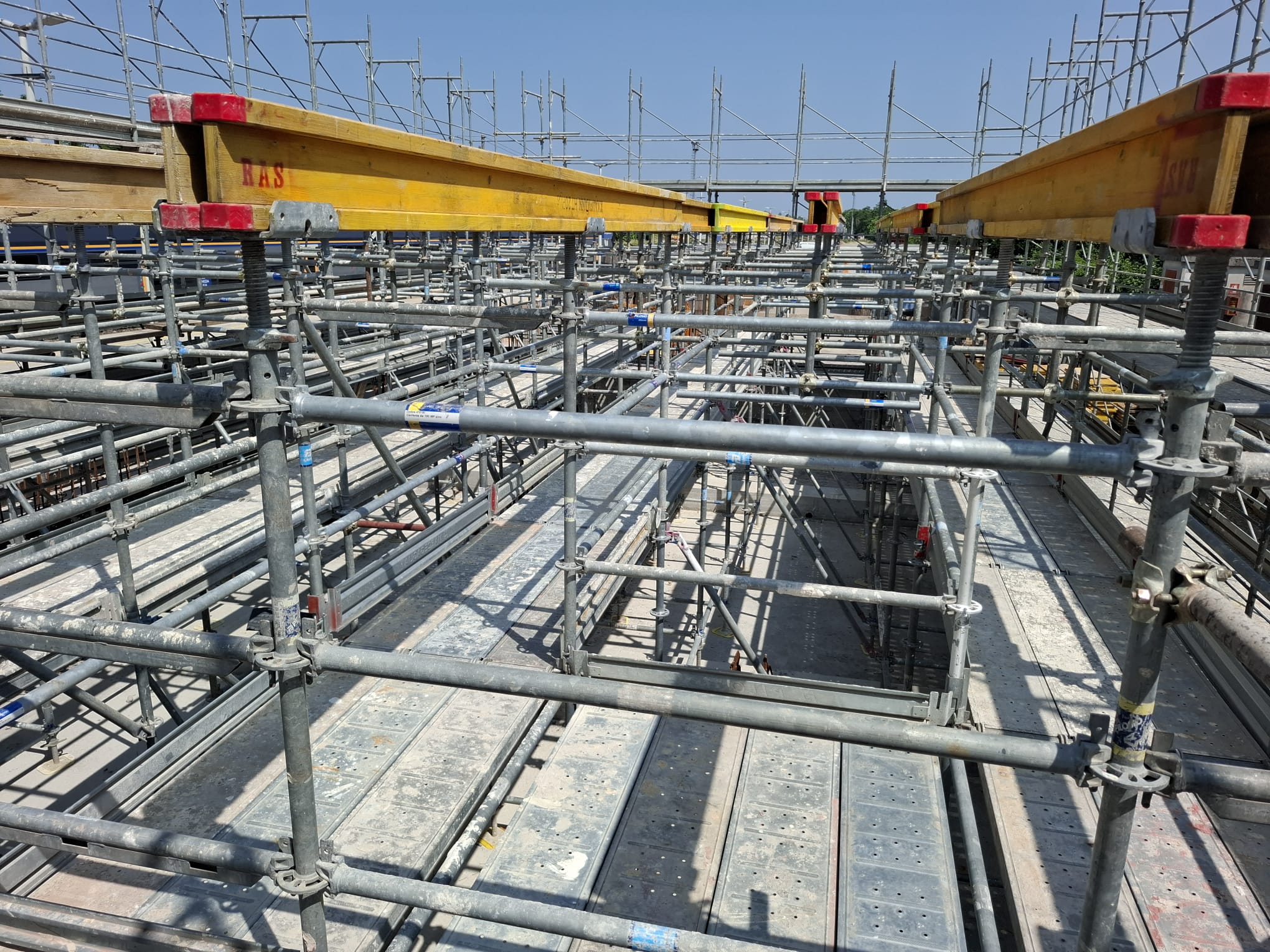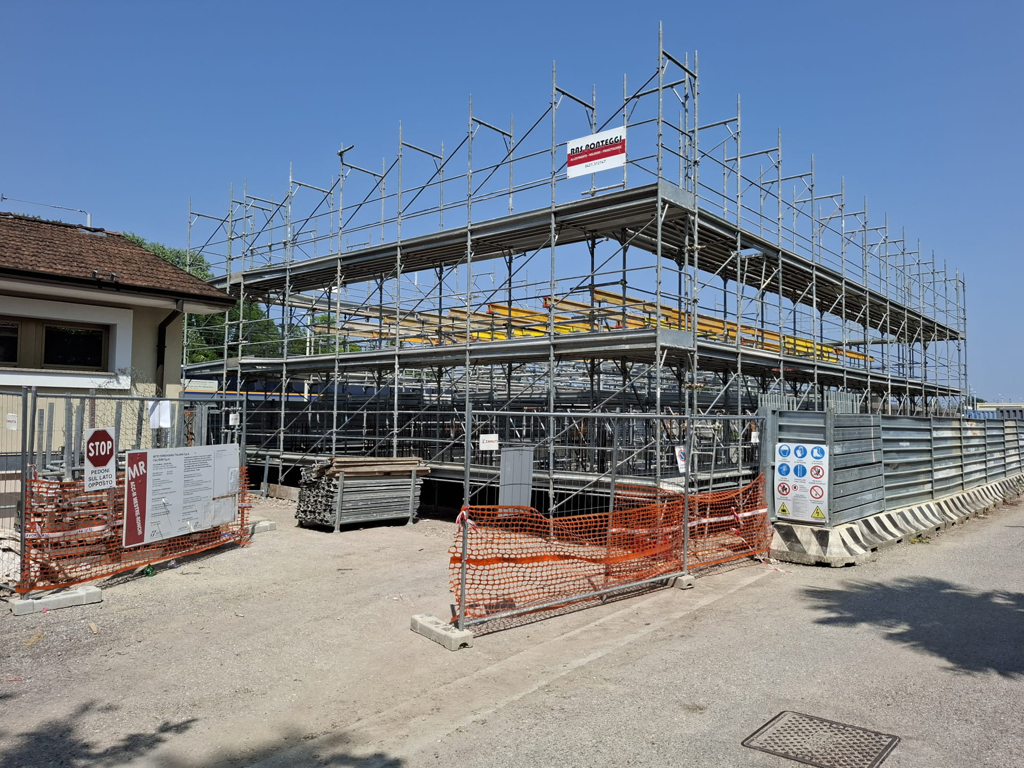 Il montaggio del ponteggio rientra nelle lavorazioni per la realizzazione di una delle nuove stazioni sulla tratta Mestre – Ronchi Sud. Sono stati impiegati ponteggi di facciata Fracasso e Pilosio MP, utilizzati sia per l’accesso in sicurezza sia come banchinaggio a supporto dei solai durante i getti.